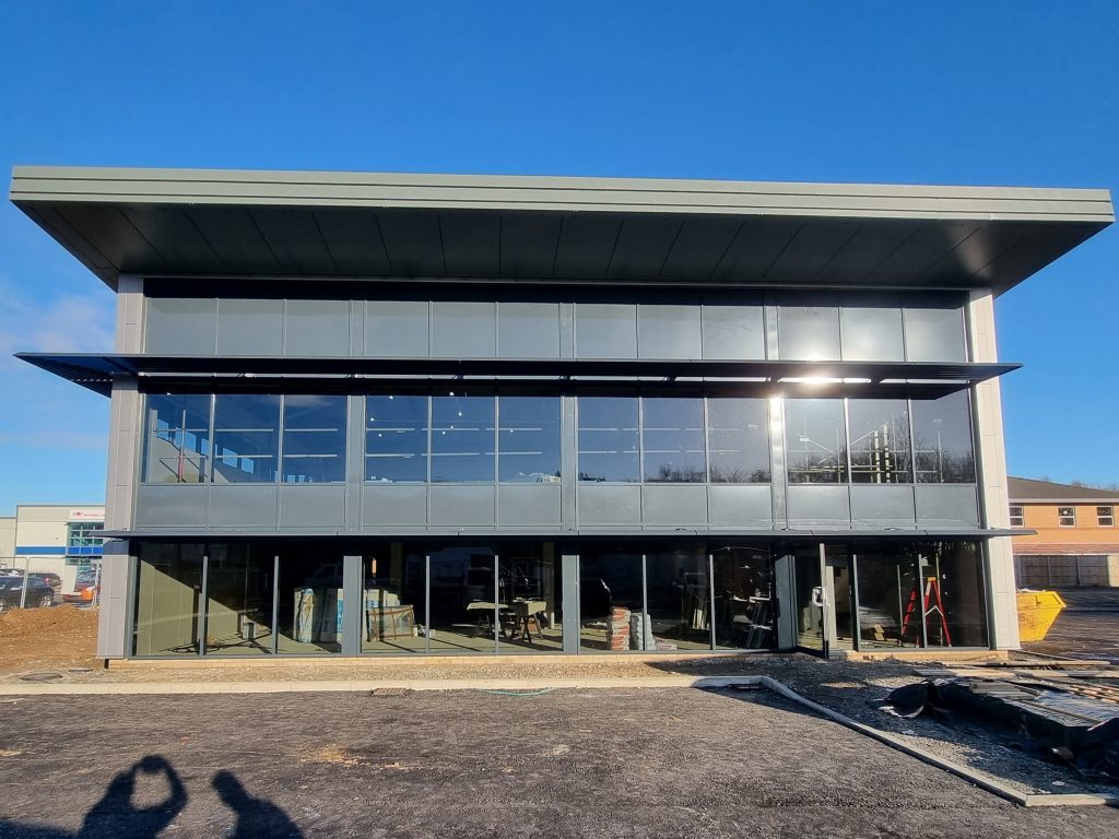 NLC supplied and installed the Louvre Screen and Brise Soleil shown below at The Sanderum Centre in Oxfordshire. The Brise Soleil brackets were installed directly onto the face of the window frames so that panels came down vertically approximately 200mm in front of the window ( to allow for cleaning ). The shading was designed to wrap around all three sizes of the glazed entrance area with the use of compound mitred blades with welded corners. EL100GG-Z Louvre Screen blades were used for the bin store screen and they were fixed back to a box section support frame via. mullions and slotted fixings cleats. All louvre screen components including the box section support frame were fabricated and installed by NLC.